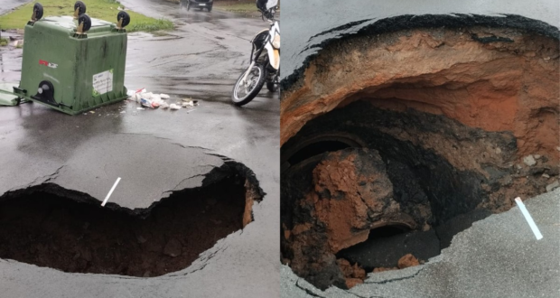 O afundamento foi causado pela pressão das fortes águas pluviais, que deslocou um tubo das galerias subterrâneas, comprometendo a base da pavimentação asfáltica no cruzamento.