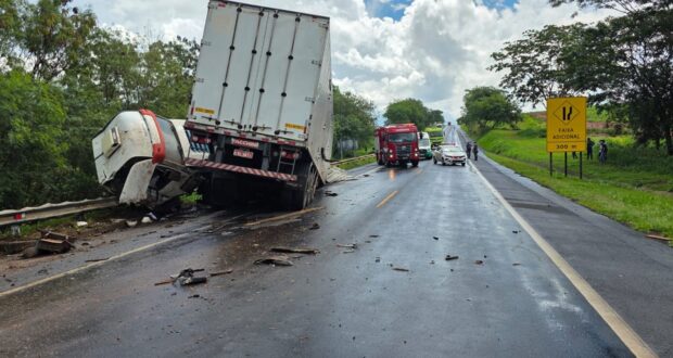 O acidente envolveu um caminhão e uma carreta. A colisão foi do tipo traseira.