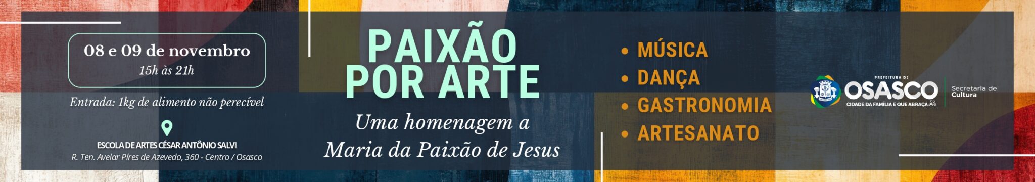 A Secretaria de Cultura da Prefeitura de Osasco realizará o evento “Paixão por Arte” nos dias 8 e 9 de novembro, das 15h às 21h, na Escola de Artes César Antônio Salvi.