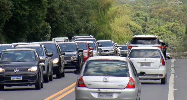 De acordo com a Concessionária Novo Litoral (CNL), responsável pela administração da via, o congestionamento se concentra entre os quilômetros 85 e 63. A causa da lentidão é o grande volume de veículos que deixam a região litorânea após o período de descanso. Apesar do tráfego intenso, não há informações sobre acidentes no trecho afetado.