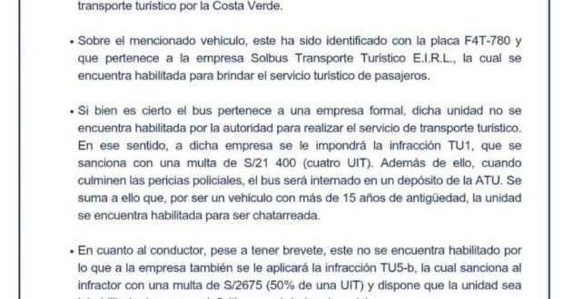 Embora a empresa Solbus Transporte Turístico E.I.R.L. possua habilitação para o serviço de transporte turístico de passageiros, a unidade específica envolvida no acidente não tinha a devida permissão. A empresa será multada em S/ 21.400 (soles peruanos), o equivalente a quatro Unidades Impositivas Tributárias, devido à infração.