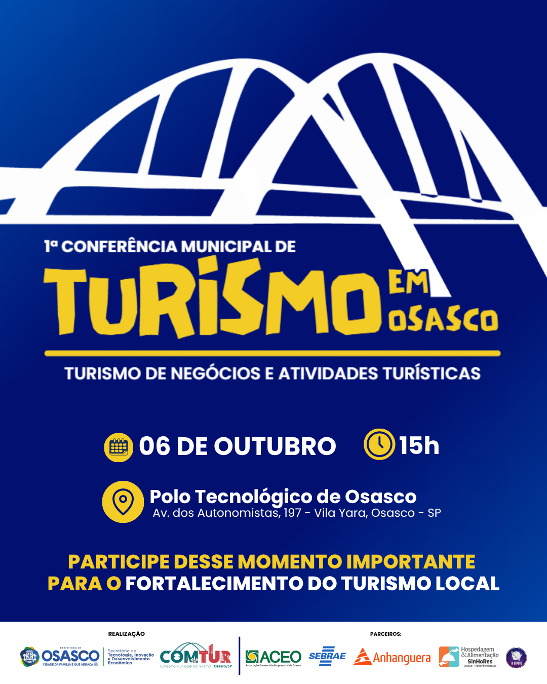 A Prefeitura de Osasco, por meio da Secretaria de Tecnologia, Inovação e Desenvolvimento Econômico (Setide), em parceria com o Conselho Municipal de Turismo de Osasco (ComTur), promoverá no dia 6 de outubro, das 15h às 17h, a 1ª Conferência Municipal de Turismo da cidade.