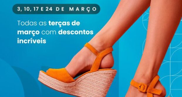 A campanha “Terça do Calçado” acontece em todas as terças-feiras de março de 2026, especificamente nos dias 03, 10, 17 e 24 de março.
