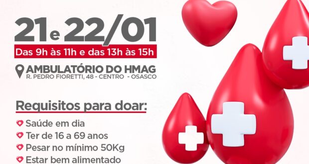 A Secretaria de Saúde da Prefeitura de Osasco, em parceria com a Fundação Pró-Sangue Hemocentro de São Paulo, realizará neste mês de janeiro duas importantes campanhas gratuitas de doação de sangue, reforçando os estoques e mobilizando a solidariedade da população.