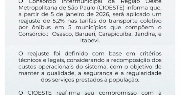 A partir de 5 de janeiro de 2026, os usuários do transporte coletivo por ônibus em cinco municípios da Região Oeste Metropolitana de São Paulo enfrentarão um reajuste de 5,2% nas tarifas. A medida, anunciada por um consórcio intermunicipal responsável pela gestão da mobilidade urbana na área, impactará diretamente os moradores de Osasco, Barueri, Carapicuíba, Jandira e Itapevi. Este reajuste de tarifas, justificado pela necessidade de recomposição dos custos operacionais do sistema, visa garantir a continuidade e a qualidade dos serviços prestados à população. A notícia surge em um momento de constante debate sobre a sustentabilidade do transporte público e a pressão inflacionária sobre os custos de manutenção e operação. A decisão foi tomada com base em análises técnicas e legais, buscando equilibrar a oferta de um serviço essencial com a viabilidade econômica de sua operação.